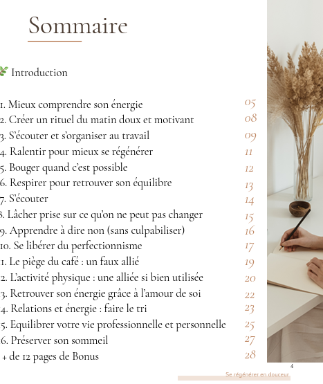 Mettre en place des solutions simples et naturelles : multiple conseils pour remnter rapidement son niveau d’énergie et surtout l’économiser, rituels de récupération, équilibre émotionnel et gestion du stress.